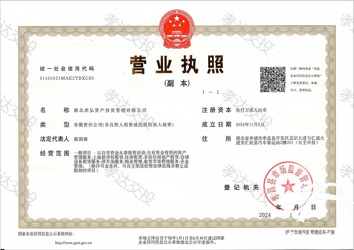 11月6日,湖北孝弘資產(chǎn)投資管理有限公司注冊成立,注冊資本3000萬元,是湖北孝達(dá)交通投資有限公司全資子公司。