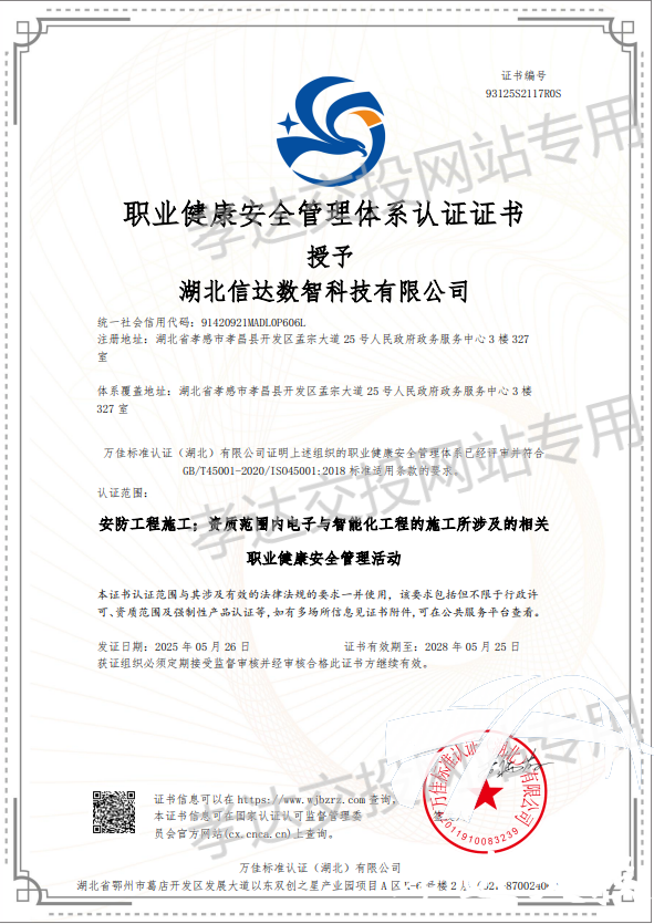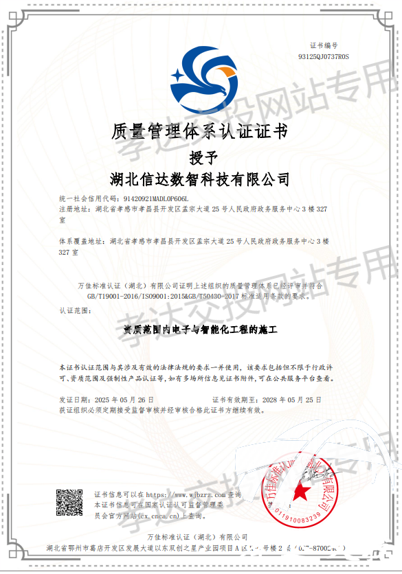 近日,湖北信達(dá)數(shù)智科技有限公司順利通過管理體系認(rèn)證,標(biāo)志著數(shù)智公司在標(biāo)準(zhǔn)化、規(guī)范化、精細(xì)化管理方面邁上新臺階!